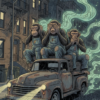 Quite inebriated, a patron wobbles out of the Brooklyn Inn bar into the brisk night as if emerging from a wrinkle in time. The music still thumping behind him—muffled, drunk on its own bassline—but the streets quiet, just the hum of passing traffic and distant sirens weaving through the night like thread through cloth. Further up Hoyt, neon lights flicker lazily, washing the patron in red one moment and blue the next, as a cop car parades by the Brooklyn Inn. The officers hoovering down doughnuts and super-sized Slurpees. At the curb, the patron, from his jacket pocket pulls out an overstuffed dimebag and Bambú paper—nothing ceremonious, nothing fancy, but there was a strange kind of reverence in the way he handled the paraphernalia, as though preparing a tiny ritual that only he fully understood. Not a guidebook step, not a method—just a quiet moment carved out of the noise. Popping open the baggie with his thumb and index, his nose now inside the bag, he takes a whiff. A waxing gibbous moon tilts the patron's head heavenward. "Whooooooaaa!" Those enjoying cigarettes and conversations laugh. Rolled tight and swole, the patron raises the joint to his mouth, feeling his pockets for a lighter only to remember that he accidentally flushed it down the toilet earlier. "#%!@$!" Suddenly, a hand extends, igniting the joint.